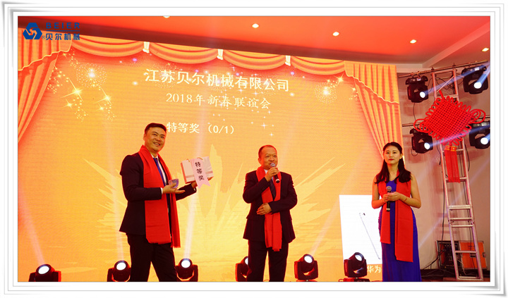 在這個辭舊迎新的時刻,江蘇貝爾機械集團2018年新春晚會于201823日晚在公司禮堂隆重舉行。江蘇貝爾機械及星貝爾全體員工以及特邀嘉賓三百余人參加了本次盛會。晚會上,由各部門員工精心準備的節目精彩紛呈,公司高管與員工親切互動、激動人心的抽獎活動,讓歌聲、掌聲、歡呼聲一直在會場上蕩漾。整場晚會高潮迭起,呈現出貝爾大家庭的歡樂和諧。