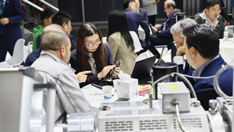 在展位現(xiàn)場(chǎng),隨處可見(jiàn)前來(lái)參觀交流的專(zhuān)業(yè)觀眾,有的是咨詢集團(tuán)產(chǎn)品,有的是咨詢的集團(tuán)業(yè)務(wù)。洽談區(qū)已經(jīng)不能滿足大家的熱情,展臺(tái)內(nèi),展機(jī)旁,都是大家相談甚歡的身影。